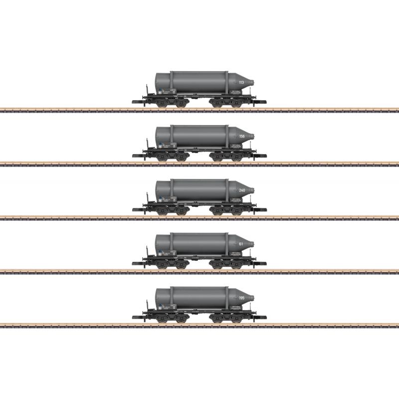 Vorbild: 5 Carbid-Flaschenwagen. Privatwagen der SKW Trostberg AG eingestellt bei der Deutschen Bundesbahn (DB). Alle Wagen im Zustand der Epoche IV.