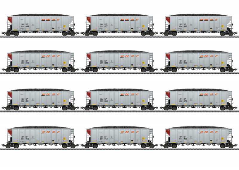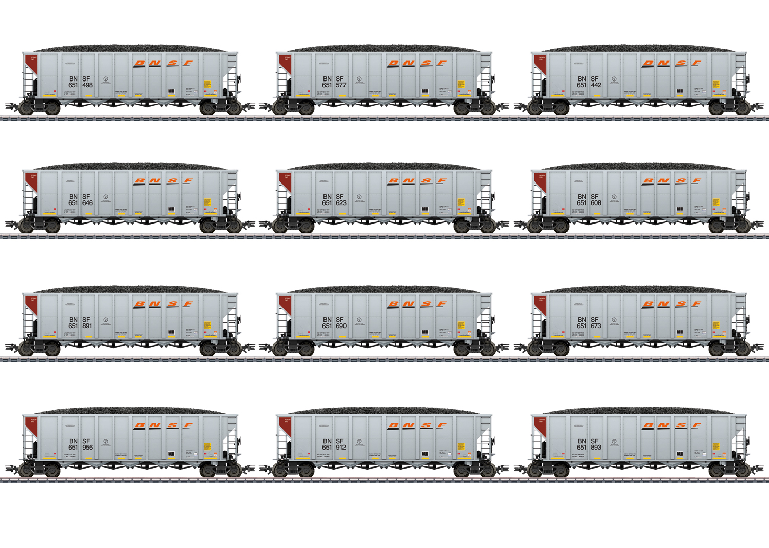 Zwölf Kohletransportwagen, sogenannte Hopper Cars, der Burlington Northern Santa Fe, LLC (BNSF). Ausführung mit fünf Entladeeinrichtungen am Wagenboden. Aktueller Betriebszustand.