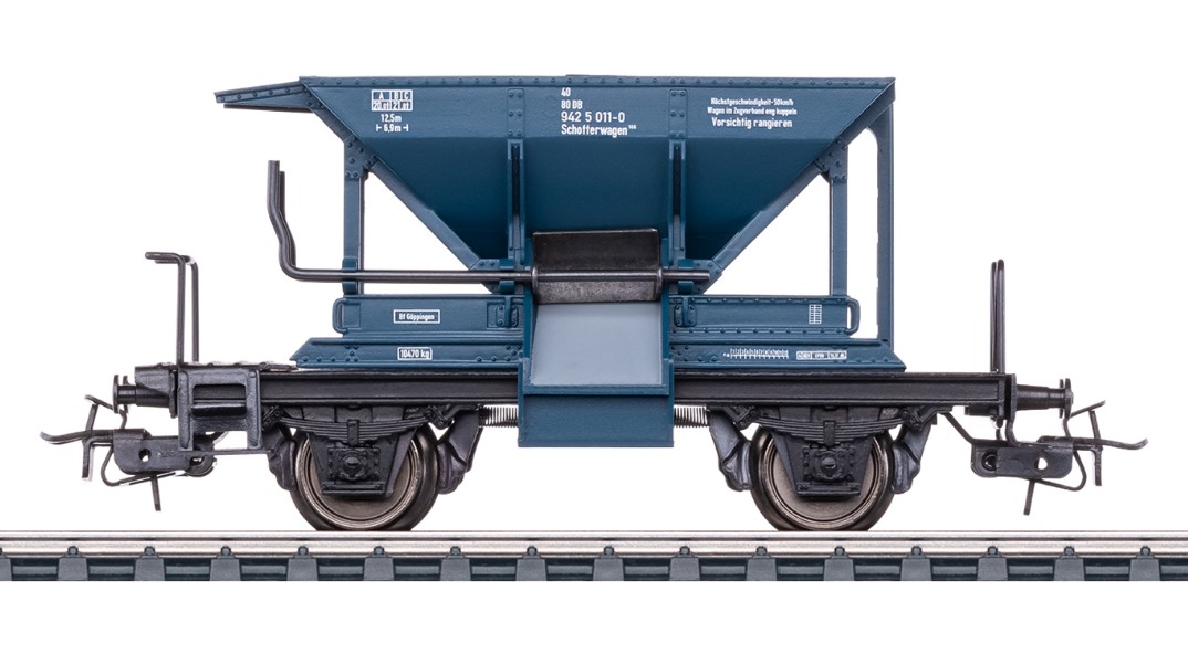 Vorbild: Schotterwagen als Bahndienstwagen Bauart Talbot. Ozeanblaue Grundfarbgebung. Deutsche Bundesbahn (DB). Betriebszustand Ende der 1980er Jahre.