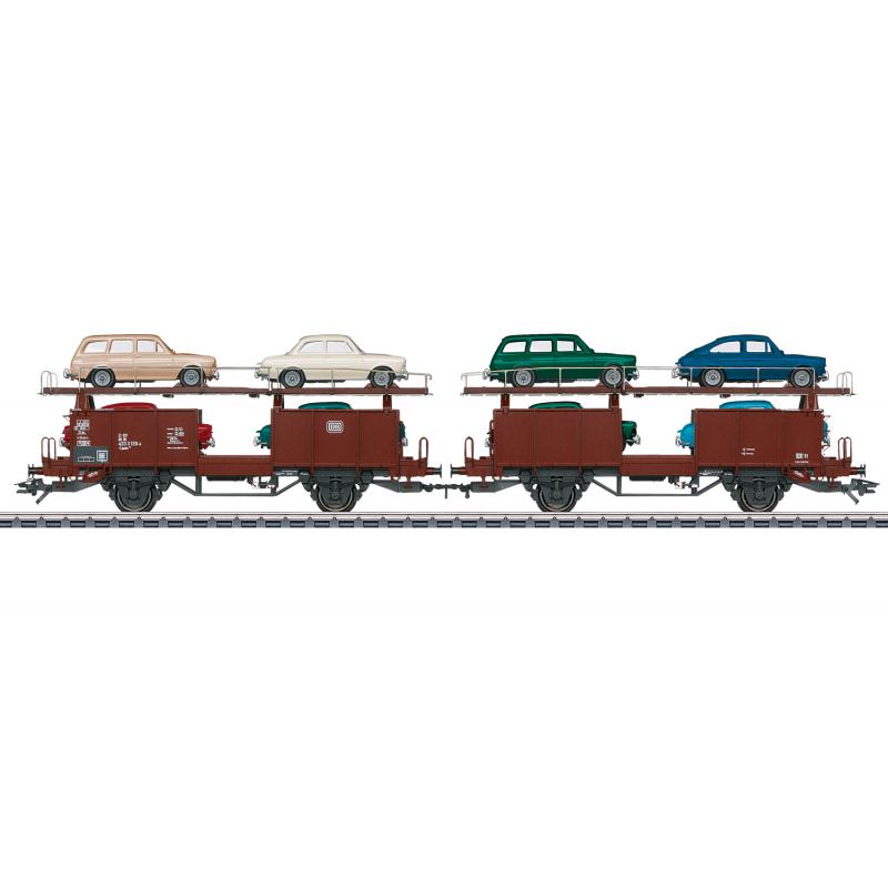 Modell: Feste Kurzkupplung zwischen den Wagenhälften. Oberdeck absenkbar. Neue Betriebsnummer. Beladen mit 8 unterschiedlichen Modellen des VW Typ 3 1500 und 1600 der Firma Brekina. Passende Haltekeile liegen bei. Länge über Puffer 25,3 cm.