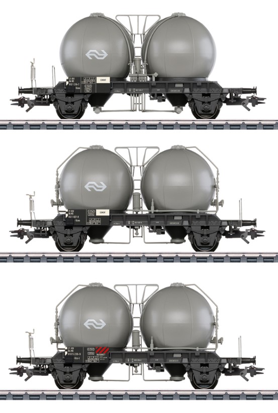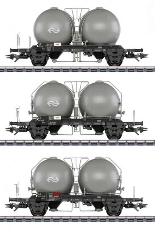 Vorbild: 3 zweiachsige Kugelbehälterwagen Typ Uces und Ucs-y der Niederländischen Eisenbahnen (NS). Wagen mit je 2 Behältern zum Transport von Zement. Beschriftet mit dem Logo der Niederländischen Staatsbahnen. Alle Wagen im Betriebszustand um 1970.