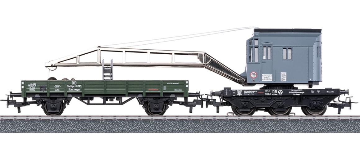 Modell: Kranwagen mit eingebauten Mini-Getriebemotoren und einem Digital-Decoder mfx in Sonderausführung, zur digitalen Steuerung des Krans. Kranschutzwagen mit Auslegerstütze zur Auflage des Kranauslegers. Der Schleifer zur Stromaufnahme ist am Kranwagen montiert. Dies ermöglicht, dass der Kranschutzwagen auch vom Kranwagen abgekuppelt werden kann. Relex-Kupplungen.