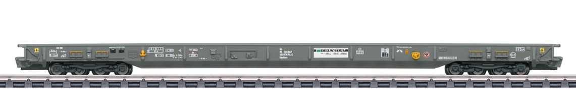 Vorbild: Niederflurtransportwagen Bauart Saadkms der RAlpin AG (Olten), für den Transitverkehr der "Rollenden Landstraße". Quarzgraue Grundfarbgebung. Betriebszustand ab 2018.