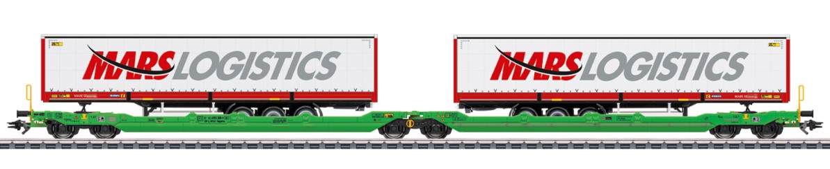 Modell: Beide Tragwagenhälften aus Metall, beweglich gelagert auf dem mittleren Drehgestell. Seitliche Klappriegel ab Werk montiert. Hochklappbar für den Transport von Containern oder Wechselbrücken. Viele separat angesetzte Details wie Tritte, Bremsleitungen und Haltestangen an den Wagenenden. Drehgestelle Bauart Y25. Pufferhöhe nach NEM. Halterungen für Königszapfen in hoher und niedriger Ausführung, Rangiertritte und Luftkessel für die Wagenenden liegen als separat ansteckbare Teile bei. Beladen mit zwei Gardinenplanen-Sattelaufliegern der Spedition Mars. Länge über Puffer ca. 39,3 cm. Gleichstromradsatz E700580.