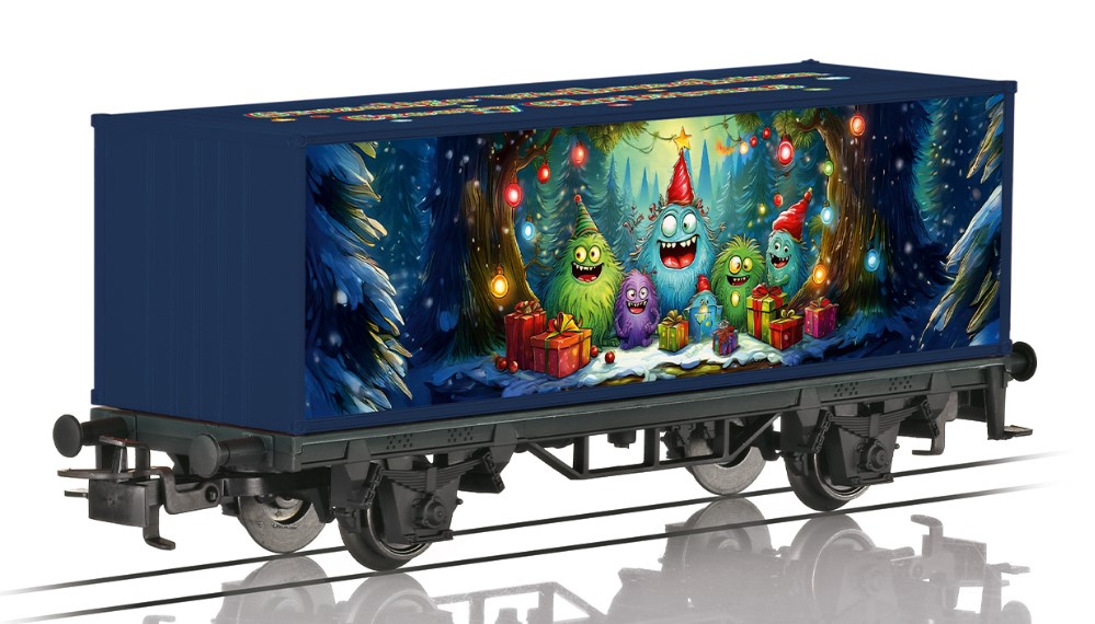 Vorbild: Zweiachsiger Containerwagen in einer coolen, jugendlichen Weihnachtsgestaltung.