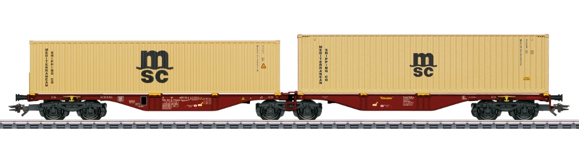 Modell: Vorbildgerecht durchbrochene Tragwagen-Böden aus Metall, mit markanten fischbauchartigen Außenlangträgern. Drehgestelle Typ Y 25. Beide Tragwagen-Hälften liegen beweglich gelagert auf dem mittleren Drehgestell auf. Unterseite der Tragwagen-Böden mit angesetzten Bremsleitungen und Luftbehältern. Klappbare Übergänge an der Oberseite der Tragwagen-Böden über dem mittleren Drehgestell im Gelenk-Bereich. Separat angesetzte Haltestangen an den Wagenenden und Rangierhaken. Beladen mit zwei 40-ft. Boxcontainern zum Abnehmen. Länge über Puffer 30,7 cm. Gleichstromradsatz E700580.