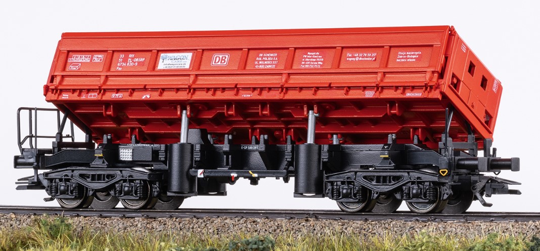 Vorbild: 3 vierachsige offene Seitenkippwagen Bauart Fas der DB Schenker Rail Polska S.A., mit gerippten Seitenwänden und Übergangsbühnen. Verkehrsrote Grundfarbgebung. Betriebszustand um 2016.