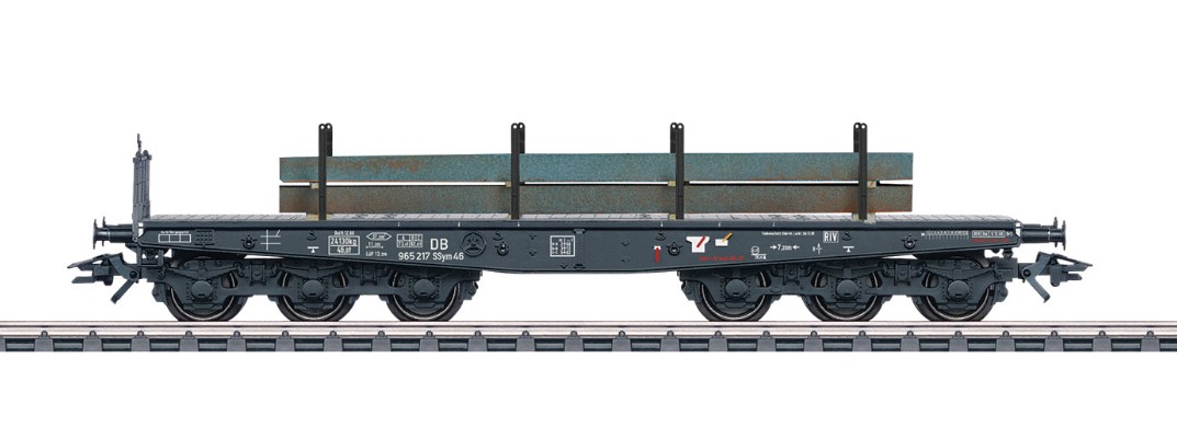 Vorbild: Schwerlast-Flachwagen der Bauart Ssym 46 der Deutschen Bundesbahn (DB), zum Transport von schweren Gütern.