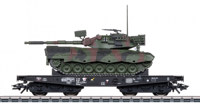 Vorbild: Schwerlast-Flachwagen Bauart Rlmmps 650 der Deutschen Bundesbahn (DB), beladen mit einem Kampfpanzer Leopard 1A1 der Deutschen Bundeswehr.