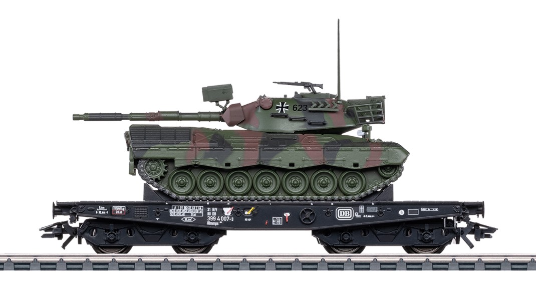 Vorbild: Schwerlast-Flachwagen Bauart Rlmmps 650 der Deutschen Bundesbahn (DB), beladen mit einem Kampfpanzer Leopard 1A1 der Deutschen Bundeswehr.