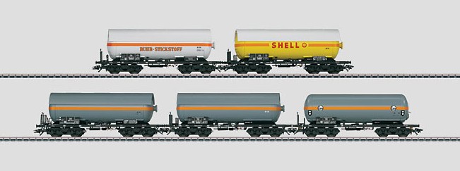 Vorbild: 5 vierachsige Druckgas-Kesselwagen unterschiedlicher Bauarten mit Sonnenschutzdach und ohne Sonnenschutzdach. Privatwagen der Firmen Eva Eisenbahn-Verkehrsmittel AG, Düsseldorf, VTG GmbH, Hamburg und Ruhr-Stickstoff AG, Bochum. Alle Wagen eingestellt bei der Deutschen Bundesbahn (DB). Betriebszustand um 1962.