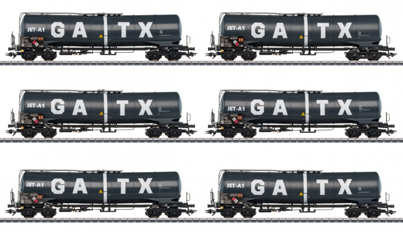 Vorbild: Sechs Vierachsige Kesselwagen Bauart Zans mit einem Fassungsvermögen von 95 m3. Privatwagen der GATX Rail Germany GmbH mit Zusatzaufschrift zum Ladegut „JET-A1“, registriert in Deutschland. Anthrazitgraue Grundfarbgebung. Betriebszustand ab 2017.