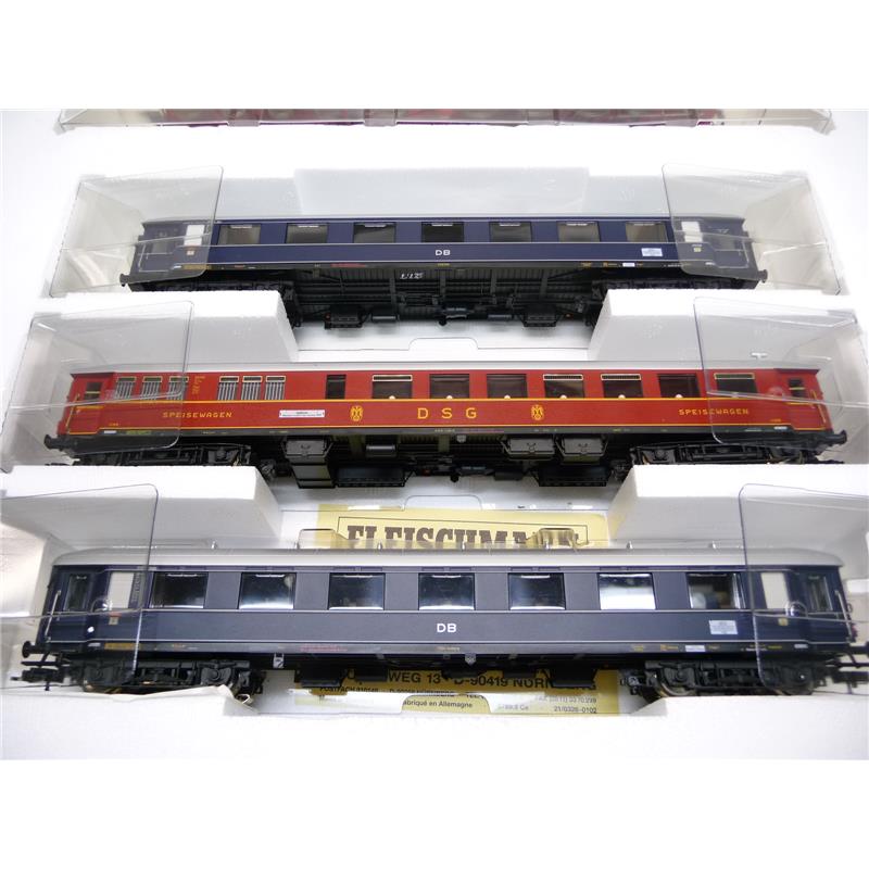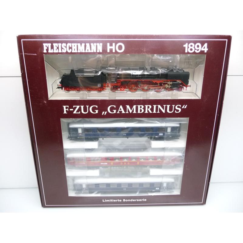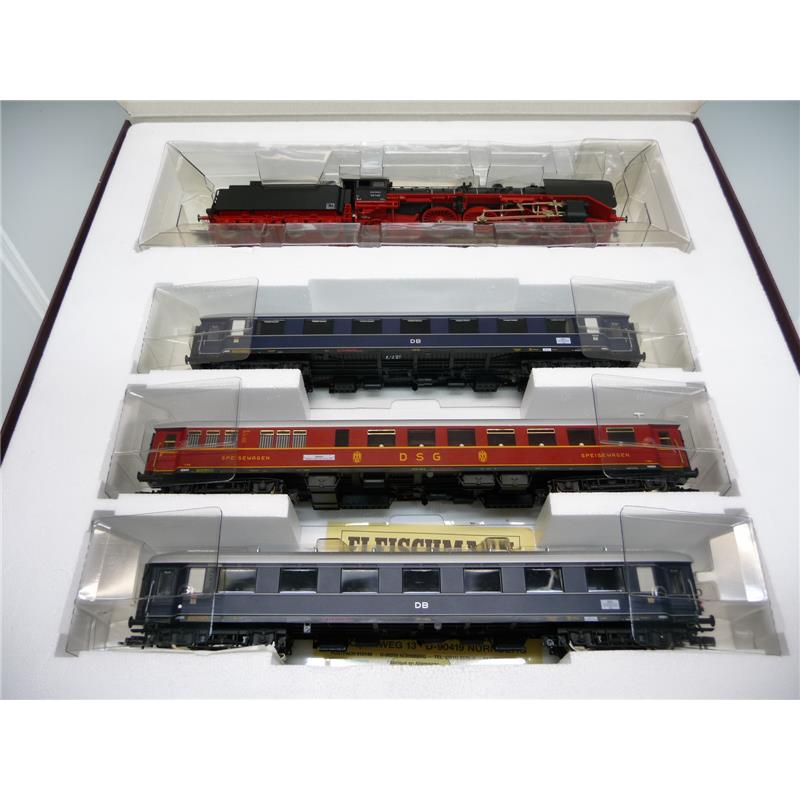 Das Set F-Zug "Grambrinus" von Fleischmann besteht neben einer Dampflok der Baureihe 03 mit Wagner-Windleitblechen, hellen Kesselringen und Zweilicht-Spitzenbeleuchtung, die für die frühe Epoche III typisch war, aus drei Reisezugwagen. Mit dem Gepäckwagen 5843 läßt sich der F-Zug ideal ergänzen.