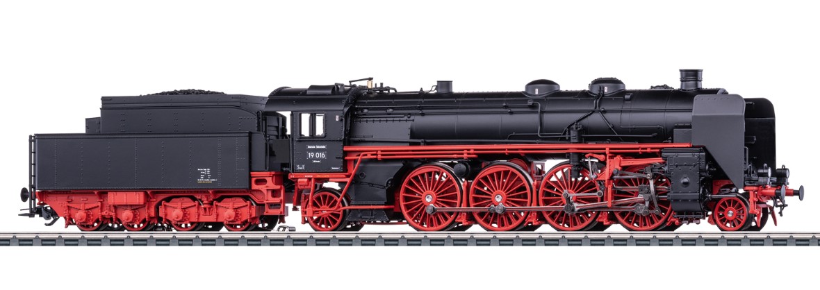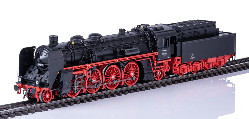 Vorbild: Schnellzug-Dampflokomotive Baureihe 19.0 "Sachsenstolz" (Sächsische Gattung XX HV), mit sächsischem Kohlen-Schlepptender 2´2 T31. Deutsche Reichsbahn der DDR (DR/DDR). Mit großen Windleitblechen. Lok-Betriebsnummer 19 016. Betriebszustand Epoche IIIa, Anfang der 1950er Jahre.