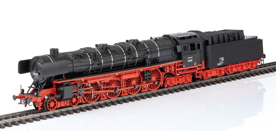 Vorbild: Schnellzug-Dampflokomotive 06 002 der Deutschen Bundesbahn (DB). In originalgetreuer Umsetzung ohne Stromlinienverkleidung, mit Kohlen-Schlepptender 2´3 T38, Zweilicht-Spitzensignal, Witte-Windleitbleche und einseitiger Indusi. Heimatbetriebswerk Hamm. Betriebszustand 1952.