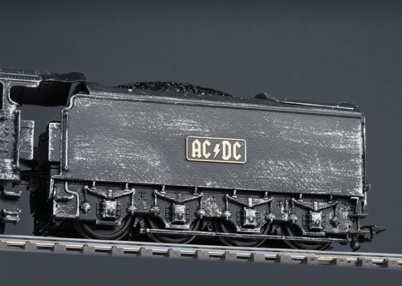 Mit Digital-Decoder mfx+ und umfangreichen Licht- und Soundfunktionen. Geregelter Hochleistungsantrieb mit Schwungmasse im Kessel. Drei Achsen angetrieben. Haftreifen. Lokomotive und Tender weitgehend aus Metall. Serienmäßig eingebauter Raucheinsatz, mit geschwindigkeitsabhängigem, dynamischem Rauchausstoß, digital schaltbar. Frontscheinwerfer mittig auf der Rauchkammertür der Lok und eine Lampe an der Tenderrückseite konventionell in Betrieb, digital schaltbar. Die Beleuchtung des Frontscheinwerfers kann auf rot umgeschaltet werden. Die AC/DC typischen Teufelshörner sind beleuchtet und können digital zugeschaltet werden. Führerstandsbeleuchtung und Feuerbüchsenflackern digital schaltbar. Beleuchtung des Tender-Durchgangs digital schaltbar. Beleuchtung mit wartungsfreien warmweißen und roten Leuchtdioden (LED). Verstellbare Kurzkupplung mit Kinematik zwischen Lok und Tender. Am Tender kinematikgeführte Kurzkupplung mit NEM-Schacht. Pufferhöhe an Lok und Tender nach NEM. Bremsschläuche, Schraubenkupplungsimitationen und geschlossene Zylinderdeckel liegen bei. Länge über Puffer ca. 24,5 cm.