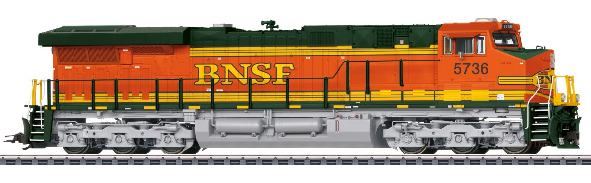 Vorbild: Schwere dieselelektrische Güterzuglokomotive Typ General Electric ES44AC der Burlington Northern Santa Fe, LLC (BNSF). Orange Grundfarbgebung. Betriebsnummer 5736. Aktueller Betriebszustand.