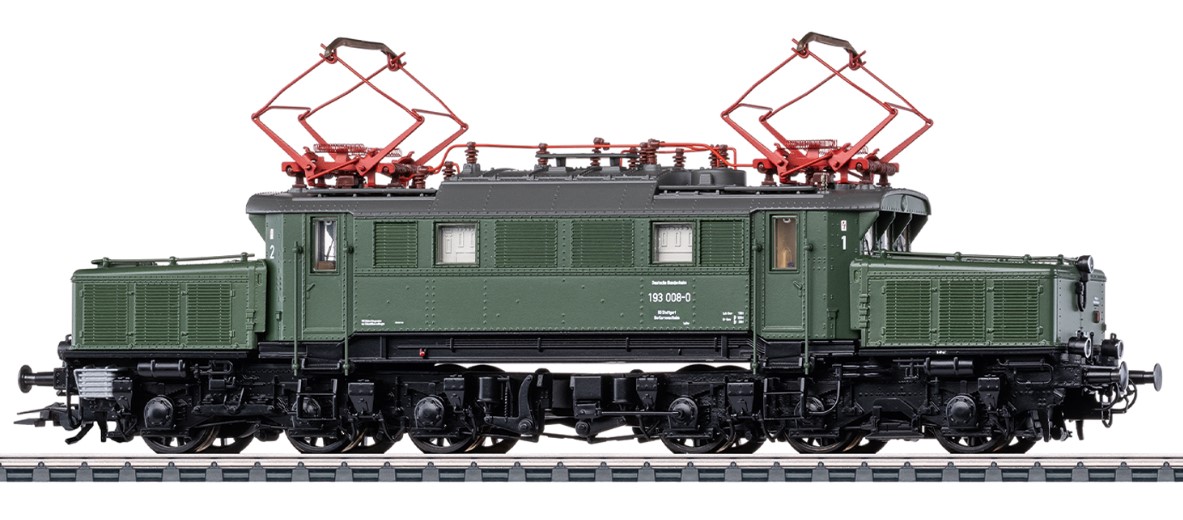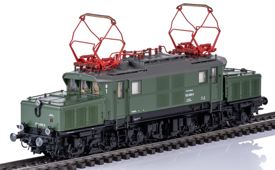 Vorbild: Schwere Güterzug-Elektrolokomotive Baureihe 193 der Deutschen Bundesbahn (DB). Chromoxidgrüne Grundfarbgebung. 6 Sandkästen, Anfahrlampe und Indusi. Lok-Betriebsnummer 193 008-0. BD Stuttgart, Bw Kornwestheim. Betriebszustand um 1976.