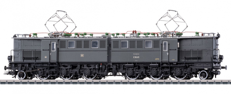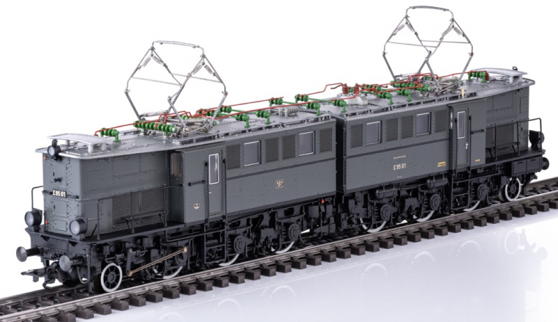 Vorbild: Schwere Güterzug-Elektrolokomotive Baureihe E 95 der Deutschen Reichsbahn-Gesellschaft (DRG). Für den Einsatz vor schweren Kohleganzzügen im schlesischen Netz. Blaugraue Grundfarbgebung. Die Elektrolokomotive war lange Zeit die größte Elektrolokomotive Deutschlands. Lok-Betriebsnummer E 95 01. Betriebszustand um 1928.