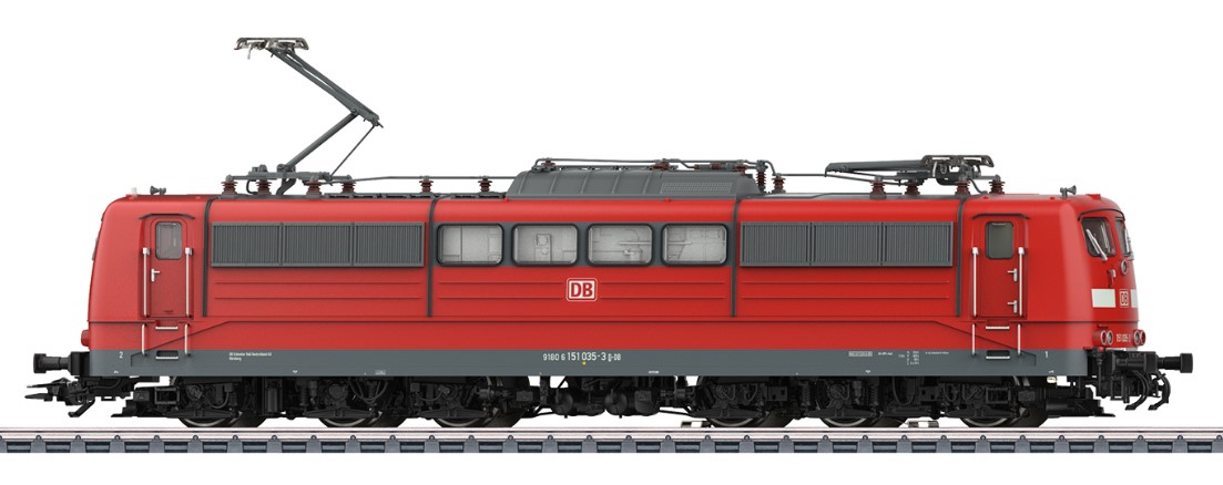 Vorbild: Elektrolokomotive Baureihe 151 der Deutschen Bahn AG. Verkehrsrote Grundfarbgebung. Betriebsnummer 151 035-3. Betriebszustand ab 2008.