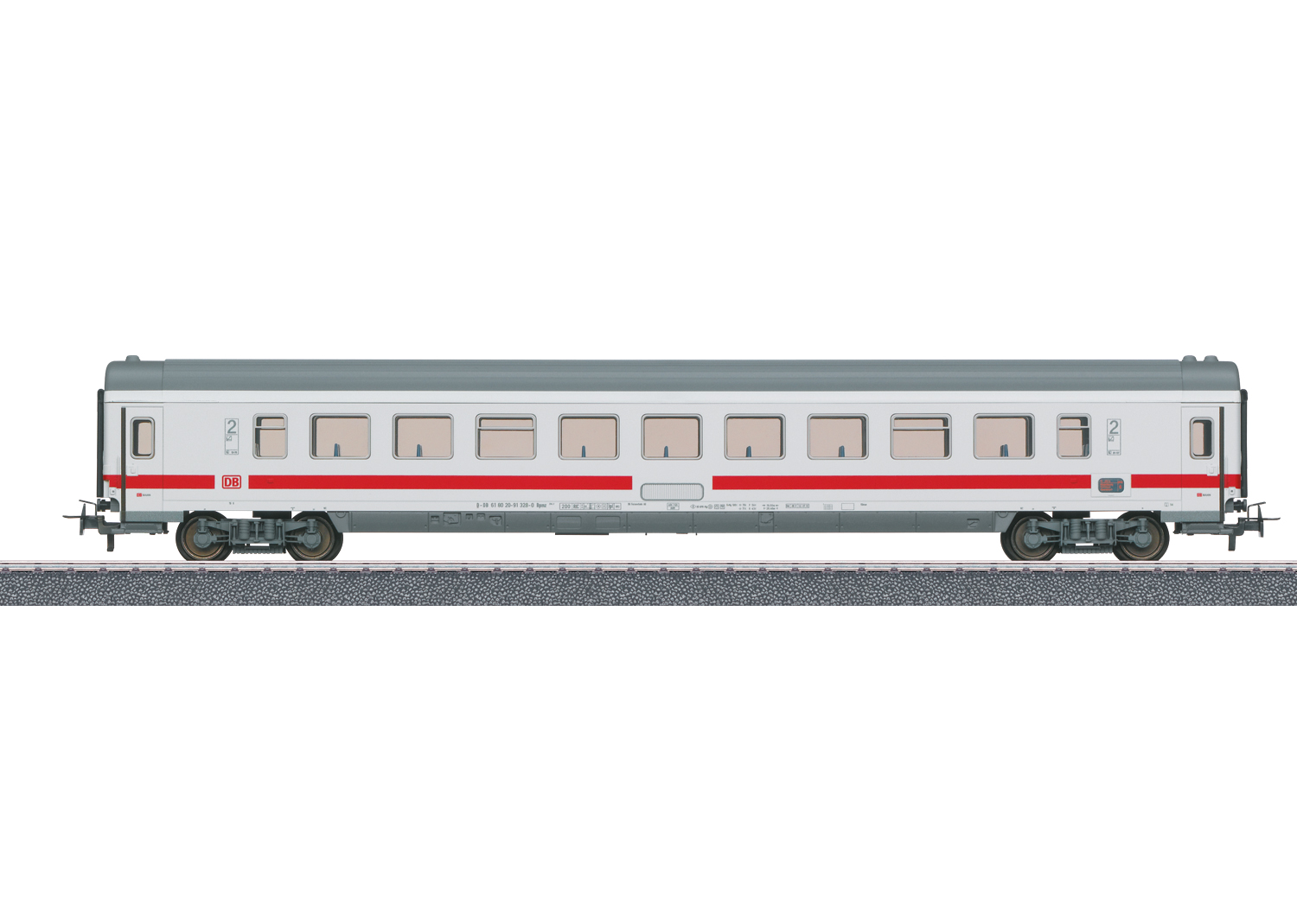 InterCity Großraumwagen im weiß-roten Farbdesign. Vorbereitet zur stromführenden Wagenverbindung wahlweise mit steckbaren Kurzkupplungsdeichseln 7319 oder trennbaren Kurzkupplungen 72020/72021.