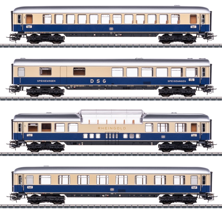 Vorbild: 4 vierachsige TEE-Reisezugwagen unterschiedlicher Bauarten der Deutschen Bundesbahn (DB). Kobaltblau/beige Rheingold-Farbgebung. 1 TEE-Großraumwagen Ap4üm-62, 1. Klasse. 1 TEE-Speisewagen WR4üm-64, 1. Klasse. 1 TEE-Aussichtswagen AD4üm-62, 1. Klasse. 1 TEE-Abteilwagen Av4üm-62, 1. Klasse. Betriebszustand um 1962.