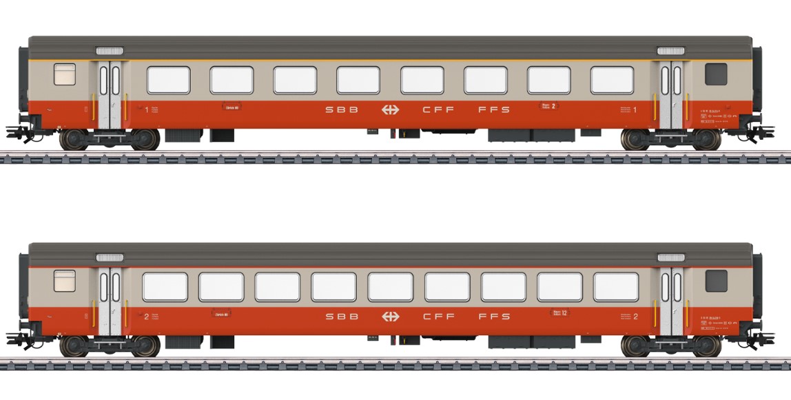Vorbild: Zwei Einheits-Personenwagen Typ EWIII der Schweizerischen Bundesbahnen (SBB/CFF/FFS). Ein Großraumwagen Bauart A, 1. Klasse und ein Großraumwagen Bauart B, 2. Klasse. Kieselgrau/Blutorange Grundfarbgebung des Swiss Express. Zuglauf: Genève–Lausanne–Bern–Zürich HB. Wagen-Ordnungsnummern 2 und 12. Betriebszustand ab 1975.