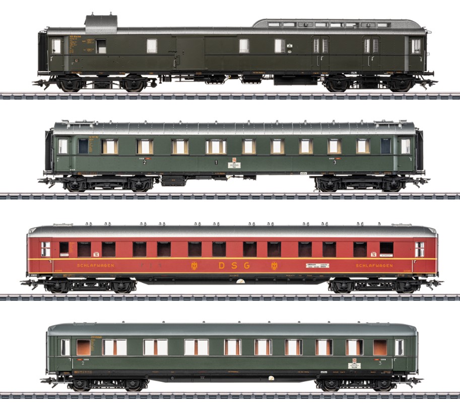Vorbild: Schnellzugwagen-Set besteht aus den folgenden 4 Wagen unterschiedlicher Bauarten zum Schnellzug D 74. 1 vierachsiger Gepäck- und Postwagen PwPost4ü. 1 vierachsiger Sitzwagen ABC4ü, 1./2./3. Klasse (Einheitsbauart 1928-30). 1 vierachsiger Schürzen-Schlafwagen WLAB4ü(e) der DSG. 1 vierachsiger Schürzenwagen BC4üwe, 2./3. Klasse. Zuglauf: D 74 Hamburg Altona - Basel SBB, für den Streckenabschnitt Frankfurt-Basel SBB. Deutsche Bundesbahn (DB) und Deutsche Speisewagen- und Schlafwagen-Gesellschaft (DSG). Betriebszustand um 1955.
