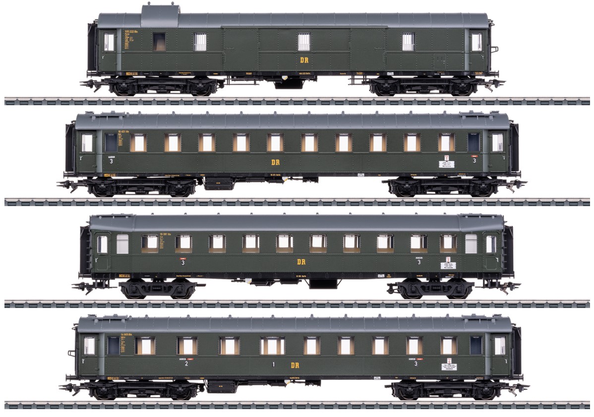 Vorbild: 4 Schnellzugwagen der Einheitsbauart 1928-30 und 1923 "Hecht" der Deutschen Reichsbahn der DDR (DR/DDR). 1 Schnellzug-Gepäckwagen Pw4ü-29. 1 Schnellzugwagen C4ü-28, 3. Klasse, Ordnungsnummer 1. 1 Schnellzugwagen C4ü-23 "Hecht", 3. Klasse, Ordnungsnummer 2. 1 Schnellzugwagen ABC4ü-29, 1./2./3. Klasse, Ordnungsnummer 4. Zuglauf für den Schnellzug D 11: Dresden-Warnemünde, mit Kurswagen Praha-Kobenhavn (Wagen mit Ordnungsnummer 4). Alle Wagen in flaschengrüner Grundfarbgebung. Betriebszustand Epoche IIIa, Anfang der 1950er Jahre.
