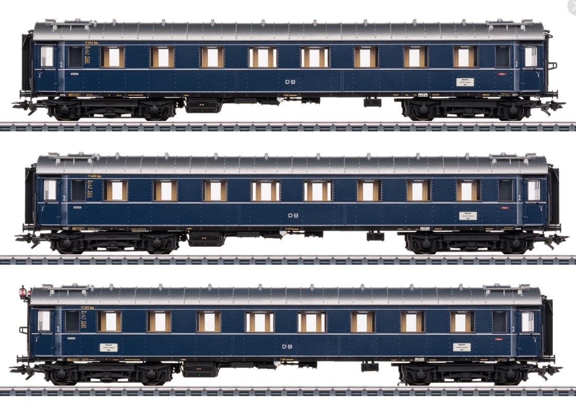 Modell: Detaillierte Ausführung in vollem Längenmaßstab. Alle Wagen mit serienmäßig eingebauter LED-Innenbeleuchtung mit warmweißen Leuchtdioden (LED) und Pufferkondensator. Ein Wagen serienmäßig an einem Ende mit Zugschlussbeleuchtung ausgestattet. Der an diesem Wagen befindliche Schleifer für die Stromaufnahme versorgt über die serienmäßig eingebauten stromführenden Kurzkupplungköpfe den ganzen Wagenverband mit Strom. Dazu ist eine fest definierte Fahrzeugreihenfolge vorgegeben. An beiden Enden des Wagenverbandes sind die normalen neuen Kurzkupplungsköpfe für niedrigere Pufferhöhen eingesetzt. Reisezugwagen mit mehrfarbiger Inneneinrichtung. Drehgestelle der Bauart Görlitz II schwer. Stirnseitig separat angesetzte Aufstiegsleitern und angesetzte Griffstangen. Befahrbarer Mindestradius 360 mm. Gesamtlänge über Puffer ca. 75,5 cm.