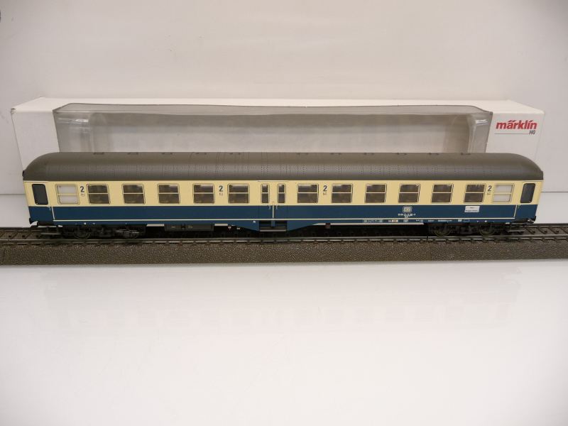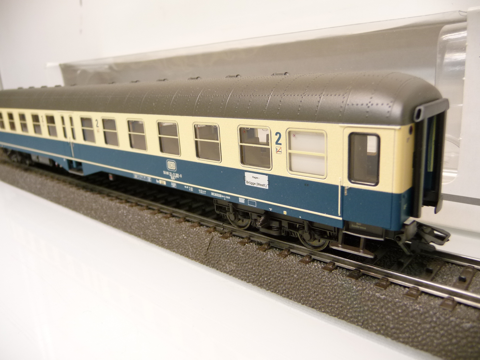 Serienmäßig eingebaute LED-Innenbeleuchtung und Strom führende Kupplungen. Die Innenbeleuchtung funktioniert nur im Verbund mit dem Mitteleinstiegs-Steuerwagen und kann über einen Decoder im Steuerwagen digital ein- und ausgeschaltet werden. Stirnseitig rot transparente Schlusslicht-Einsätze an den Wagenenden. Typspezifisch gestalteter Unterboden. Drehgestelle Bauart Minden-Deutz schwer mit Doppelklotzbremse und Generator D 62s. Befahrbarer Mindestradius 360 mm. Für die Präsentation in einer Vitrine liegen WC-Fallrohre und Wendezugsteuerleitungen als separat ansteckbare Teile bei. Länge über Puffer 28,2 cm Die passenden Wagen finden Sie im Märklin H0-Sortiment unter der Artikelnummer 43125 und 43335.