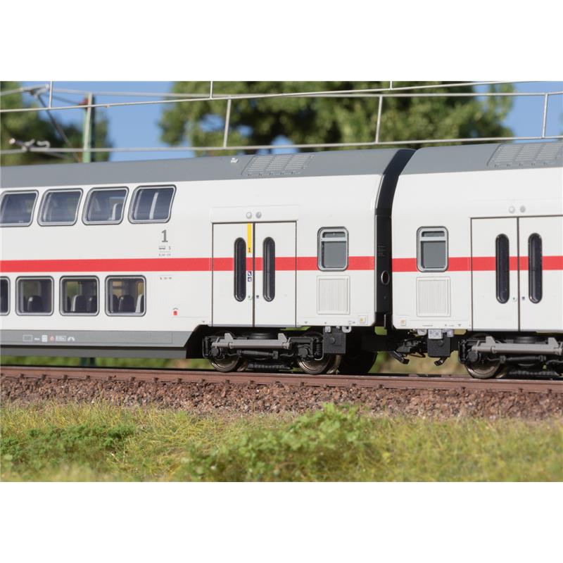 Befahrbarer Mindestradius 360 mm. Mit Hoch-Einstieg über den Drehgestellen. Serienmäßig mit eingebauter LED-Innenbeleuchtung auf beiden Ebenen. Zur Lokomotiv-Seite mit normalem Kurzkupplungskopf, zur Seite des Wagen-Verbandes mit stromführender, trennbarer Kurzkupplung. Beleuchtete längsseitige Zugzielanzeigen. Innenbeleuchtung funktioniert nur im Verbund mit dem Doppelstock-Steuerwagen und kann über einen Decoder im Steuerwagen digital ein- und ausgeschaltet werden. Dazu ist eine definierte Fahrzeugreihenfolge vorgegeben. Stirnseitig rot transparente Schlusslicht-Einsätze an den Wagenenden. Vorbildgerechte Drehgestelle der Bauart Görlitz, mit angesetzten Klapptrittstufen. Länge über Puffer 28,6 cm.