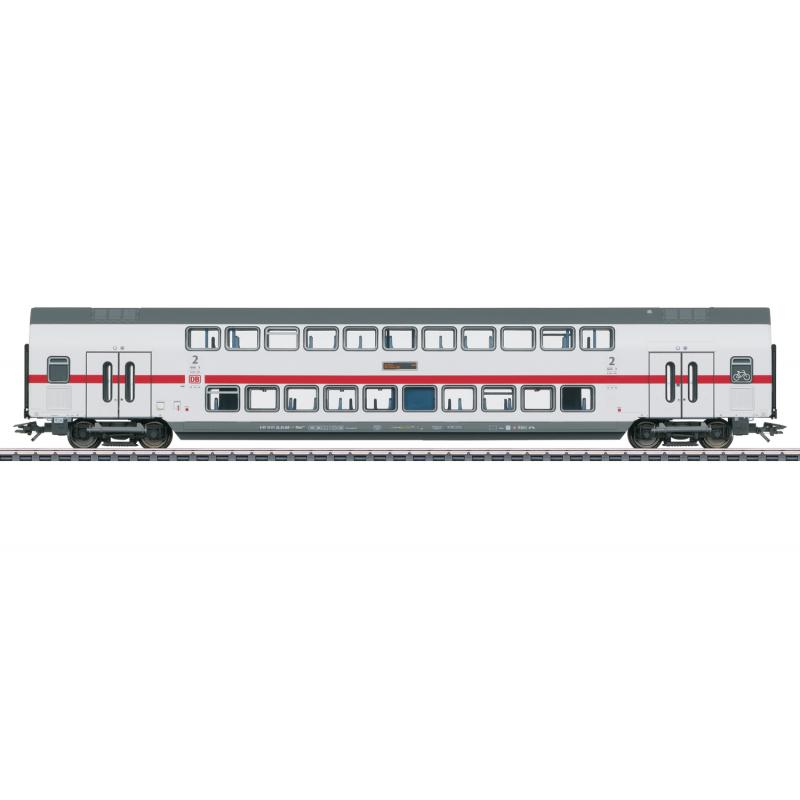 Befahrbarer Mindestradius 360 mm. Mit Hoch-Einstieg über den Drehgestellen. Serienmäßig mit eingebauter LED-Innenbeleuchtung auf beiden Ebenen und stromführenden, trennbaren Kurzkupplungen. Beleuchtete längsseitige Zugzielanzeigen. Innenbeleuchtung funktioniert nur im Verbund mit dem Doppelstock-Steuerwagen und kann über einen Decoder im Steuerwagen digital ein- und ausgeschaltet werden. Dazu ist eine definierte Fahrzeugreihenfolge vorgegeben. Stirnseitig rot transparente Schlusslicht-Einsätze an den Wagenenden. Vorbildgerechte Drehgestelle der Bauart Görlitz, mit angesetzten Klapptrittstufen. Länge über Puffer 28,6 cm. Die passende Elektrolokomotive der Baureihe 146.5 finden Sie ebenfalls im Märklin H0-Sortiment unter der Artikelnummer 37449, zur Bildung einer vorbildgerechten 6-teiligen Zugeinheit mit den Doppelstockwagen 43486, 43487, 43488, 43489 und 43490. Ein Befahren von gebogenen Rampenstücken ist gegebenenfalls nur nach entsprechender Modifikation dieser Auffahrten möglich.