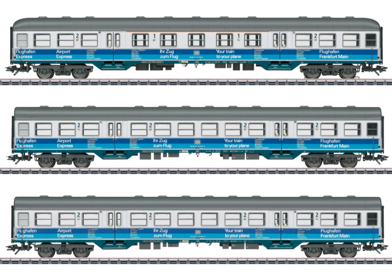 Drei Nahverkehrswagen der Deutschen Bundesbahn (DB), umgangssprachlich bekannt als Silberlinge. Zwei Wagen 2. Klasse und ein Wagen 1./2. Klasse mit auffälliger Werbegestaltung als Airport Express Frankfurt (M). Betriebszustand ab 1982.