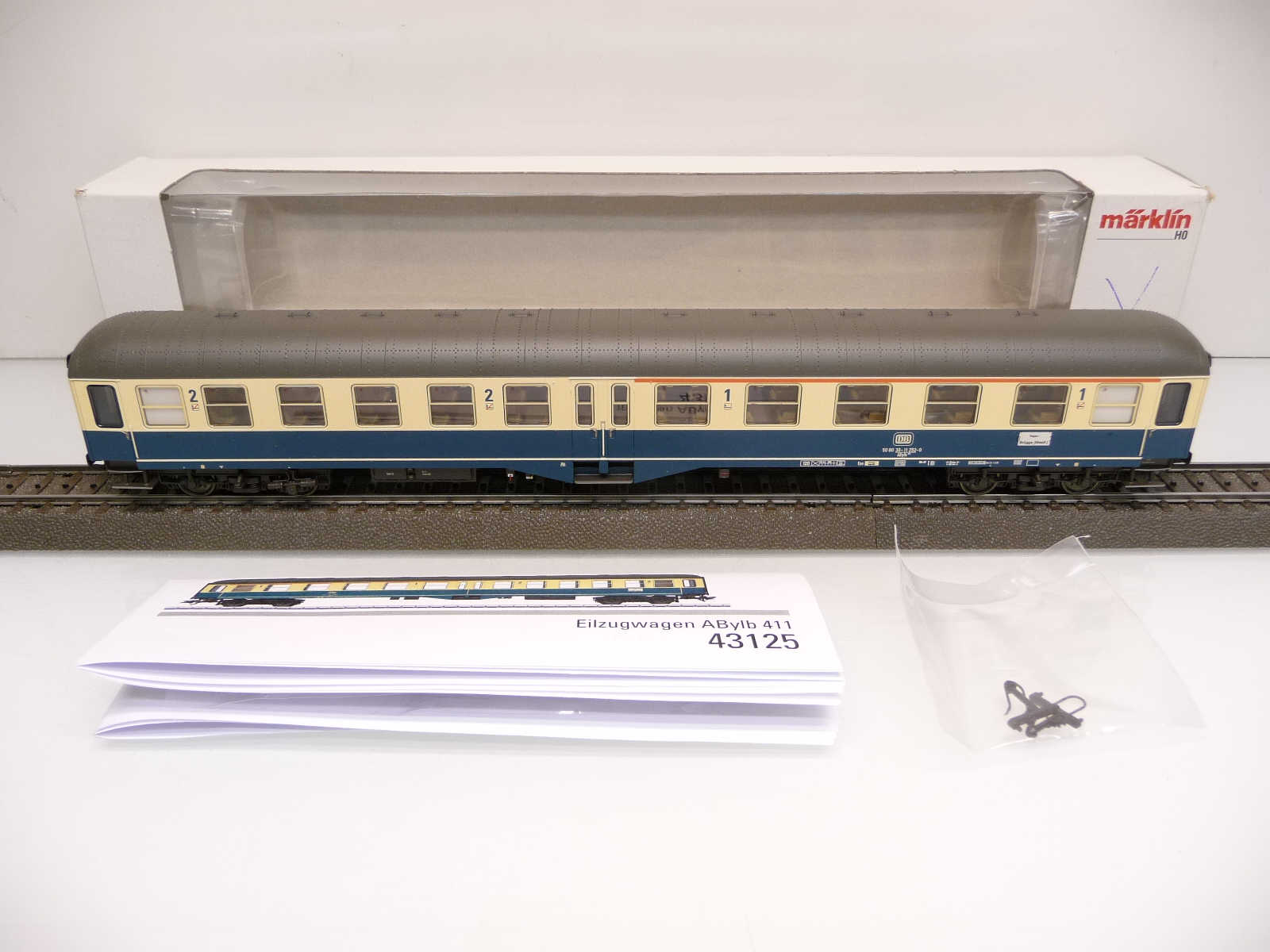 Vorbild: Reisezugwagen 1./2. Klasse der Deutschen Bundesbahn (DB) für sogenannte leichte Schnellzüge (LS). Bauart ABylb 411. Umgangssprachlich auch als „Mitteleinstiegswagen“ bekannt. Ausführung mit stirnseitig oben liegenden kleinen Schlussleuchten und einteiligen Fenstern an den Einstiegen am Wagenende. Farbgebung in Ozeanblau/Elfenbein. Betriebszustand 1984.