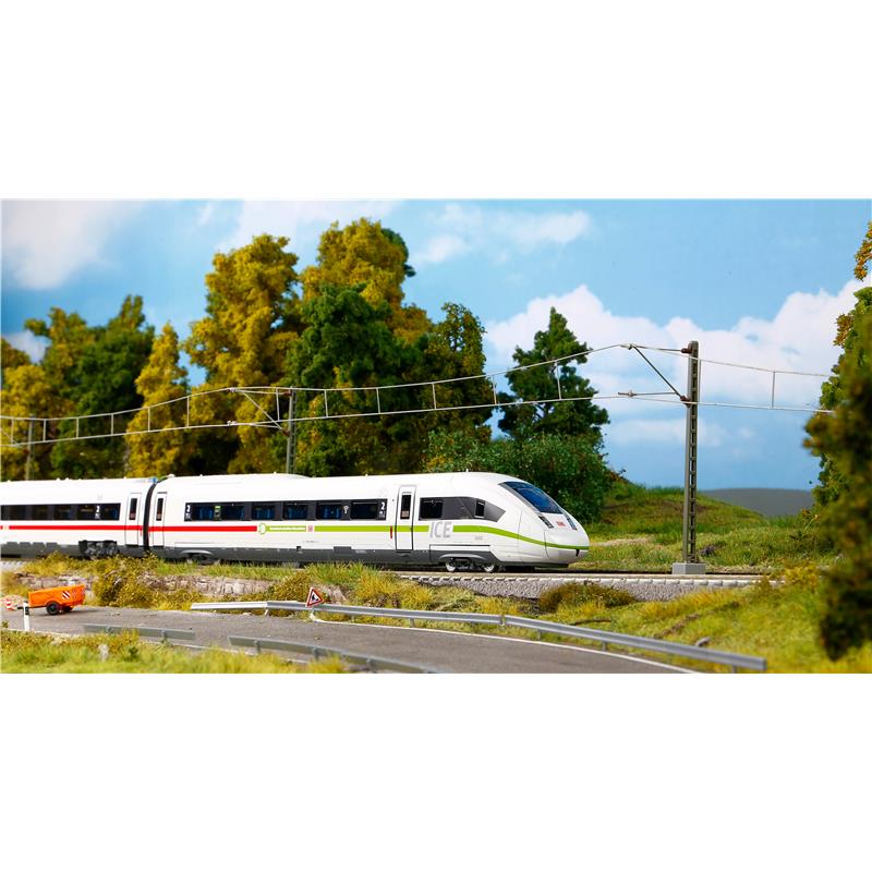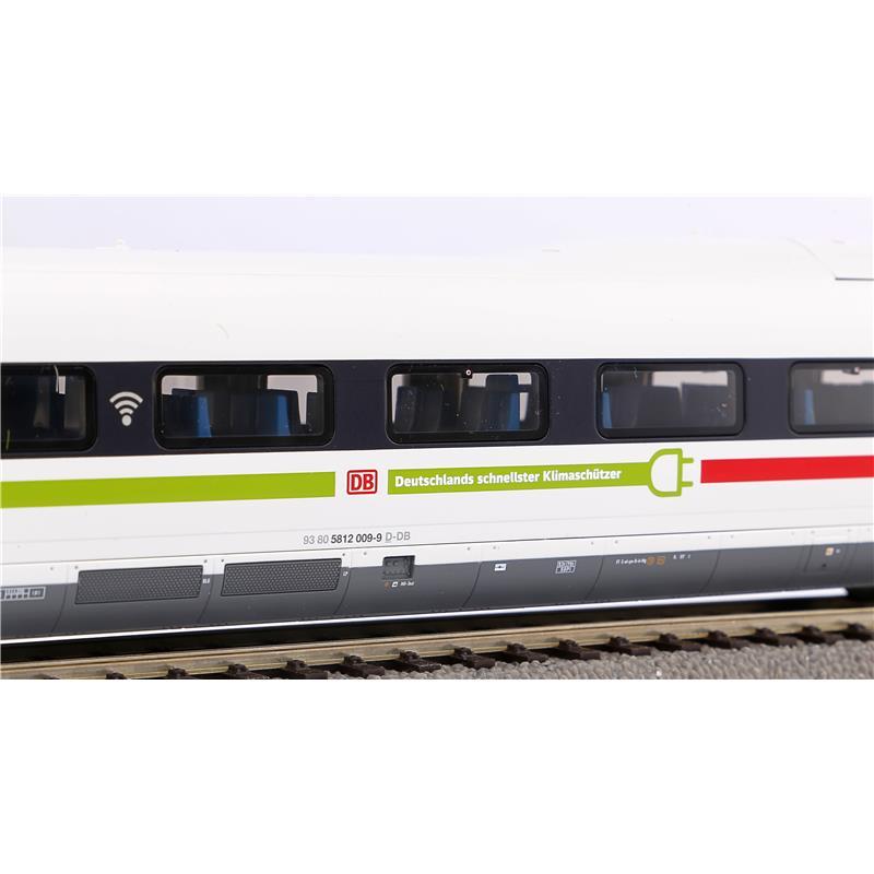 Neuheit 2021: Jetzt in aktueller "Klimaschützer" Ausführung. Der Zug begeistert durch feinste Bedruckung, abnehmbare Frontkappen zum Kuppeln von 2 Triebzügen, realistisch unterschiedliche Ausführungen der Wagen, Stromabnahme von allen Rädern der Endwagen, stromführende Kupplungen und Lichtwechsel weiß/rot. Die Stromabnahme für stromlose Abschnitte wird ohne bremsende Mechanik vom führenden Endwagen ausgesteuert, so dass der Zug trotz angetriebenem Motorwagen in der Mitte exakt vor Halt zeigenden Signale zum Stehen kommen kann. Das aufwendige Modell verfügt weiterhin über 2 starke Motoren mit Schwungmassen, Führerstandsbeleuchtung und ist ab Werk mit Innenbeleuchtung ausgestattet. Der speziell konstruierte ab Werk verbaute 20polige Decoder und das PIKO Soundmodul der neuesten Generation beherrschen die Datenformate DCC mit RailComPlus®, Motorola® und Selectrix®. Der verbaute Lautsprecher ist genau auf den Triebzug abgestimmt. Viele loktypische Geräusche wie Motorengeräusch, Signalhörner, Bremsenquietschen und weitere schaltbare Funktionen sind einzeln abrufbar. Mit einstellbarem individuellem Mapping. Das Schlusslicht ist separat schaltbar. Sound ist auch im Analogbetrieb möglich – nur Motorengeräusch. Durch die konsequent maßstäbliche Umsetzung kann der Triebzug erst ab Radius 2 eingesetzt werden!